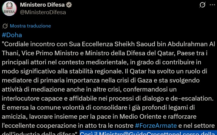 Il ministero della Difesa ha scritto su X: «ministro Guido Crosetto: cordiale incontro con Sua Eccellenza Sheikh Saoud bin Abdulrahman Al Thani, vice primo ministro e ministro della Difesa del Qatar, Paese tra i principali attori nel contesto mediorientale, in grado di contribuire in modo significativo alla stabilità regionale. Il Qatar ha svolto un ruolo di mediatore di primaria importanza nella crisi di Gaza e sta svolgendo attività di mediazione anche in altre crisi, confermandosi un interlocutore capace e affidabile nei processi di dialogo e de-escalation. È emersa la comune volontà di consolidare i già profondi legami di amicizia, lavorare insieme per la pace in Medio Oriente e rafforzare l’eccellente cooperazione in atto tra le nostre Forze Armate e nel settore dell’industria della difesa».