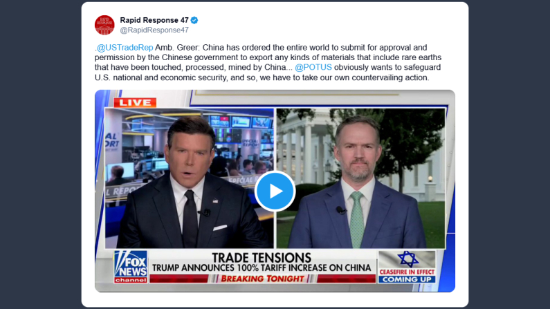 La Casa Bianca ha riportato su X le parole del rappresentante commerciale degli Stati Uniti Jamieson Greer: «La Cina ha ordinato al mondo intero di sottoporre all’approvazione del governo cinese l’esportazione di qualsiasi tipo di materiale contenente terre rare che siano state lavorate o estratte dalla Cina». Ma Trump, conclude Greer, intende «tutelare la sicurezza nazionale ed economica degli Usa, e per questo dobbiamo adottare nostre misure di contrasto».
