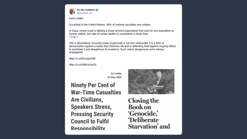 L’Ambasciatore di Israele Avi Nir-Feldklein, presso l’Unione europea, ha scritto su X: «i fatti contano. Secondo le Nazioni Unite, il 90% delle vittime in guerra è composto da civili. A Gaza, dove Israele combatte un’organizzazione terroristica brutale che usa la propria popolazione come scudi umani, il rapporto tra morti civili e combattenti è inferiore a 1,5 a 1. La guerra è devastante. Accusare Israele di genocidio non solo è infondato, ma rappresenta una forma di demonizzazione contro una nazione che ha a cuore la vita e si difende da continui tentativi di annientarla e delegittimarla. Tali affermazioni riecheggiano pericolosamente la propaganda di Hamas».
