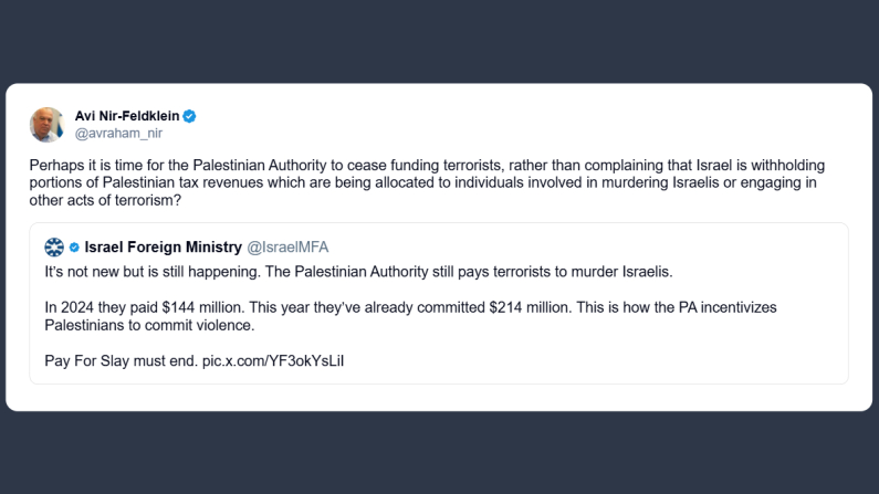 L’ambasciatore di Israele presso l’Unione europea, Avi Nir-Feldklein, ha scritto su X: «forse sarebbe ora che l’Autorità palestinese smettesse di finanziare i terroristi, invece di lamentarsi del perché Israele trattiene parte delle entrate fiscali palestinesi destinate proprio a chi uccide israeliani o compiere altri atti di terrorismo?»