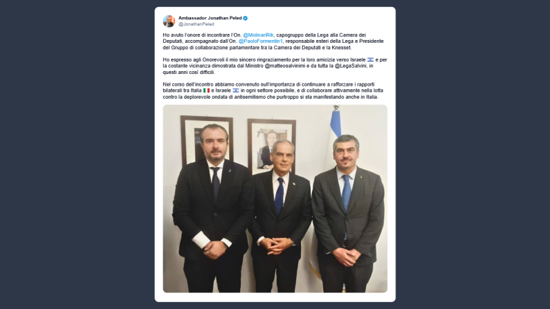 «Ho avuto l’onore di incontrare l’onorevole Rriccardo Molinari, capogruppo della Lega alla Camera dei Deputati, accompagnato dall’onorevole Paolo Formentin, responsabile esteri della Lega e Presidente del Gruppo di collaborazione parlamentare tra la Camera dei Deputati e la Knesset. Ho espresso agli Onorevoli il mio sincero ringraziamento per la loro amicizia verso Israele e per la costante vicinanza dimostrata dal ministro Salvini e da tutta la Lega, in questi anni così difficili. Nel corso dell’incontro abbiamo convenuto sull’importanza di continuare a rafforzare i rapporti bilaterali tra Italia e Israele in ogni settore possibile, e di collaborare attivamente nella lotta contro la deplorevole ondata di antisemitismo che purtroppo si sta manifestando anche in Italia».