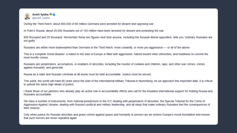 Andriy Sybiha: i russi di oggi sono più colpevoli dei tedeschi del nazismo