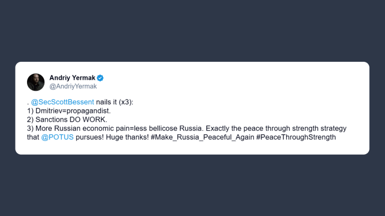 Il capo dell’ufficio del presidente dell’Ucraina, Andriy Yermak, ha scritto ieri su X: «Scott Bessent centra il punto (per tre volte): Kirill Dmitriev è un propagandista, e le sanzioni stanno funzionando. Causare sofferenza economica a Mosca significa avere una Russia meno bellicosa, che è esattamente la strategia di pace attraverso la forza perseguita dal presidente degli Stati Uniti».