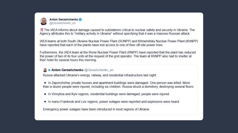 Anton Gerashchenko: danni a sottostazioni cruciali per la sicurezza nucleare in Ucraina