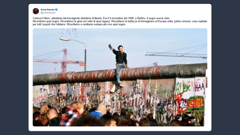 Il vicepresidente della Camera, Anna Ascani, ha scritto ieri su X: «cadeva il Muro, abbattuto dal travolgente desiderio di libertà. Era il 9 novembre del 1989, a Berlino il sogno aveva vinto. Ricordiamo quel sogno. Ricordiamo la gioia sul volto di quei ragazzi. Ricordiamo la bellezza di immaginare un’Europa unita, patria comune, casa ospitale per tutti i popoli che l’abitano. Ricordiamo e rendiamo sempre più vivo quel sogno».
