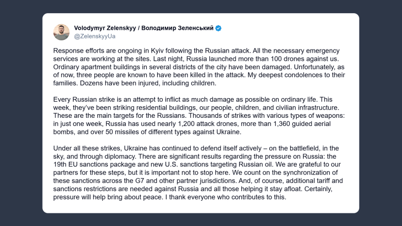 «Ieri notte la Russia ha lanciato oltre 100 droni contro l’Ucraina, danneggiando gli edifici di diversi quartieri della città». Lo ha dichiarato il presidente ucraino, Volodymyr Zelensky. «Al momento, sono stati registrati tre morti e decine di feriti, rea cui bambini». In una sola settimana, dice Zelensky, la Russia ha «schierato quasi 1.200 droni d’attacco, oltre 1.360 bombe guidate e più di 50 missili di diversi tipi contro l’Ucraina». Ma lo “spiraglio” per Kiev è rappresentato dal «19° pacchetto di sanzioni dell’Unione Europea e dalle sanzioni degli Stati Uniti sul petrolio russo. Siamo grati ai nostri partner per questi passi, ma è importante non fermarsi qui. Naturalmente, servono ulteriori restrizioni su dazi e sanzioni contro la Russia e chiunque la sostenga».