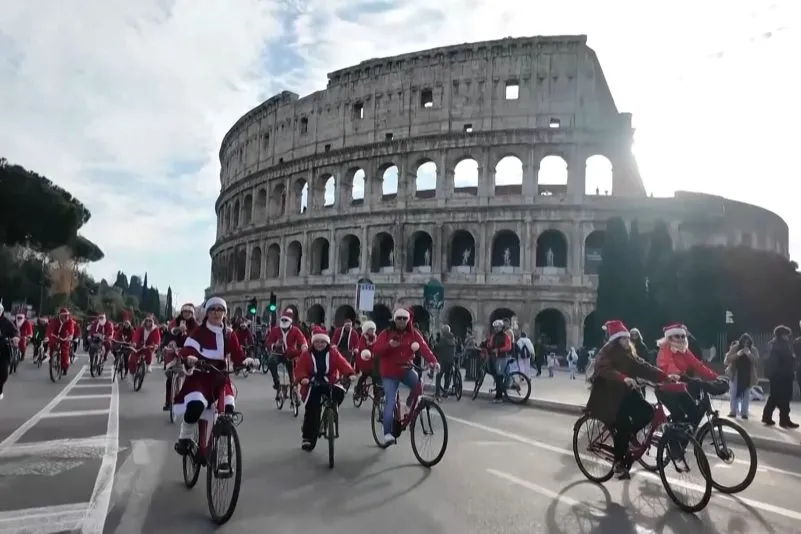 Questo Natale a Roma Babbo Natale cambia mezzo e invade la città in modo spettacolare: centinaia di Babbi Natale in bicicletta attraversano il cuore della capitale, mentre motociclisti vestiti di rosso rombano per le strade, portando allegria e spirito natalizio.