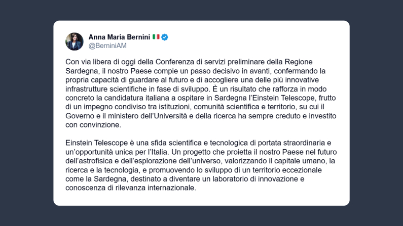Il ministro dell’Università e della Ricerca, Anna Maria Bernini, ha scritto ieri su X: «con via libera di oggi della conferenza di servizi preliminare della Regione Sardegna, il nostro Paese compie un passo decisivo in avanti, confermando la propria capacità di guardare al futuro e di accogliere una delle più innovative infrastrutture scientifiche in fase di sviluppo. È un risultato che rafforza in modo concreto la candidatura italiana a ospitare in Sardegna il telescopio Einstein, frutto di un impegno condiviso tra istituzioni, comunità scientifica e territorio, su cui il Governo e il ministero dell’Università e della ricerca ha sempre creduto e investito con convinzione. Il telescopio Einstein è una sfida scientifica e tecnologica di portata straordinaria e un’opportunità unica per l’Italia. Un progetto che proietta il nostro Paese nel futuro dell’astrofisica e dell’esplorazione dell’universo, valorizzando il capitale umano, la ricerca e la tecnologia, e promuovendo lo sviluppo di un territorio eccezionale come la Sardegna, destinato a diventare un laboratorio di innovazione e conoscenza di rilevanza internazionale».