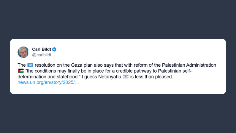 «La risoluzione dell’Onu sul piano per Gaza afferma anche che, con la riforma dell’Amministrazione palestinese, «finalmente potrebbero esserci le condizioni per un percorso credibile verso l’autodeterminazione e la statualità palestinese». Immagino che Benjamin Netanyahu non sia particolarmente entusiasta».