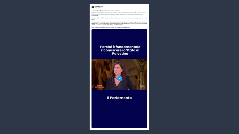 Il deputato del Partito Democratico, Laura Boldrini, ha scritto su X: «É necessario e urgente riconoscere lo Stato di Palestina. Vista l’opposizione di Israele che si arroga il diritto di decidere unilateralmente sulle sorti di un territorio non suo, senza l’intervento della comunità internazionale il popolo palestinese non avrà mai uno stato autonomo e indipendente». E senza uno Stato di Palestina che conviva con lo Stato di Israele, dice la Boldrini, non ci sarà mai «sicurezza per nessuno dei due popoli».