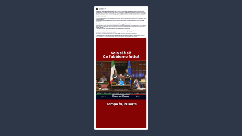 Il deputato del Partito Democratico, Laura Boldrini, ha scritto su X: «oggi diciamo basta. Basta alle sentenze nei casi di stupro in cui l’accusato viene assolto perché lei “doveva sapere cosa aspettarsi”, perché lei aveva già avuto rapporti e quindi era “in condizione di immaginarsi i possibili sviluppi della situazione”. Basta a domande come “perché non sei scappata?”, “perché non hai detto no?”, “perché non hai reagito?”. Tutto questo si chiama paura, non consenso. Si chiama paralisi, non consenso. Si chiama momentanea incapacità di intendere, non consenso. Con l’approvazione alla Camera della legge sul consenso, mettiamo nero su bianco che solo sì è sì. Che il sesso senza consenso è stupro. Grazie ai giuristi, alle giuriste e alle associazioni che sono intervenute in commissione e lo hanno fatto con grande competenza. E in particolare ad Amnesty International, promotrice della campagna: “Solo sì è sì”.