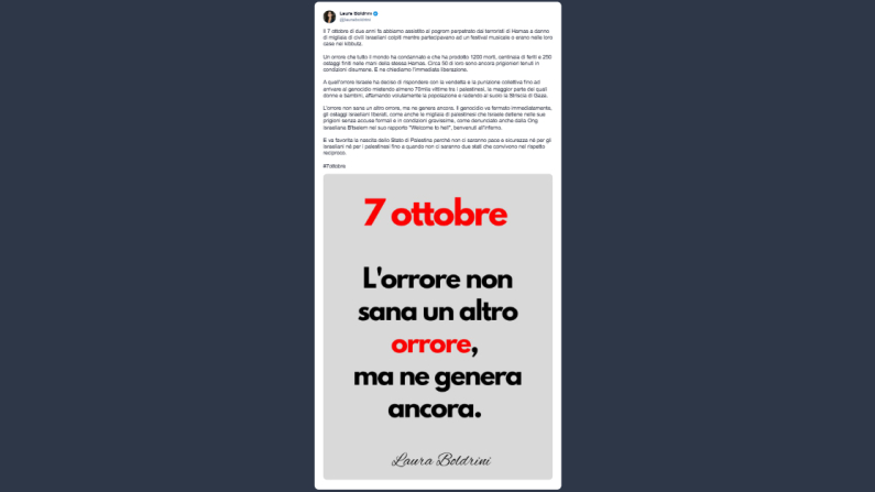 Il deputato del Partito Democratico, Laura Boldrini, ha scritto su X: «Il 7 ottobre di due anni fa abbiamo assistito al pogrom perpetrato dai terroristi di Hamas a danno di migliaia di civili israeliani […] un orrore che tutto il mondo ha condannato e che ha prodotto 1.200 morti, centinaia di feriti e 250 ostaggi finiti nelle mani della stessa Hamas. Circa 50 di loro sono ancora prigionieri tenuti in condizioni disumane. E ne chiediamo l’immediata liberazione».