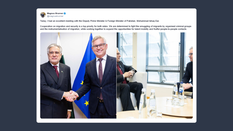 Il commissario europeo per gli Affari interni e la Migrazione, Magnus Brunner, ha scritto su X: «oggi ho avuto un ottimo incontro con il vice primo ministro e ministro degli Esteri del Pakistan, Mohammad Ishaq Dar. La cooperazione su migrazione e sicurezza è una priorità assoluta per entrambi i Paesi. Siamo determinati a contrastare il traffico di migranti gestito dalla criminalità organizzata e l’uso strumentale dei flussi migratori, lavorando al tempo stesso per ampliare le opportunità di mobilità dei talenti e di scambi proficui tra i nostri popoli».