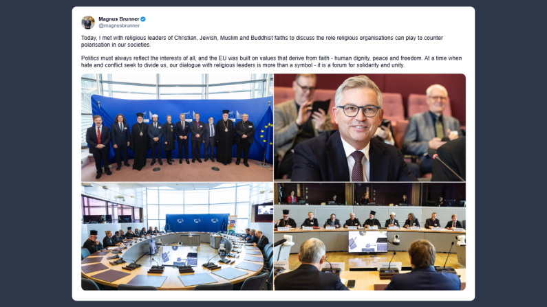 Il commissario europeo per gli Affari interni e la Migrazione, Magnus Brunner, ha scritto su X: «oggi ho incontrato i leader religiosi delle comunità cristiana, ebraica, musulmana e buddhista per discutere il ruolo che le organizzazioni religiose possono svolgere nel contrastare la polarizzazione nelle nostre società. La politica deve sempre rispecchiare gli interessi di tutti e l’Unione europea è stata costruita su valori che traggono origine dalla fede: la dignità umana, la pace e la libertà. In un momento in cui l’odio e i conflitti cercano di dividerci, il dialogo con i leader religiosi non è solo un simbolo, è un luogo di solidarietà e di unità».