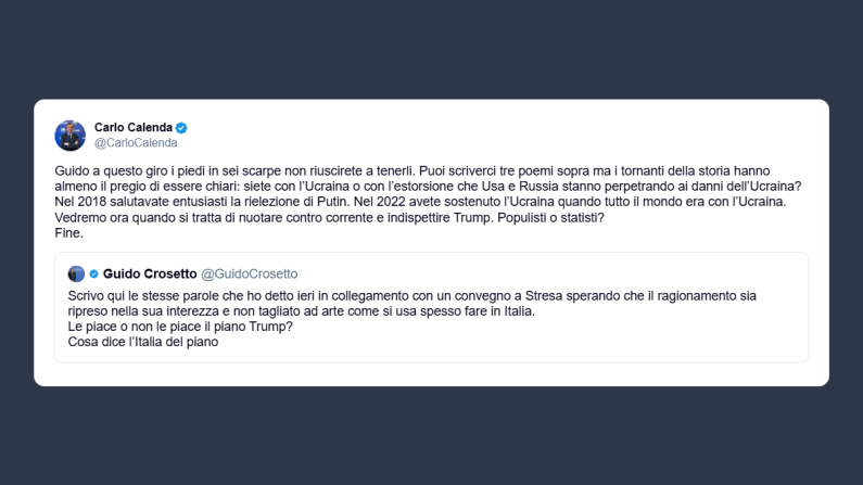Calenda nel suo commento ha dichiarato: «Guido a questo giro i piedi in sei scarpe non riuscirete a tenerli. Puoi scriverci tre poemi sopra ma i tornanti della storia hanno almeno il pregio di essere chiari, siete con l’Ucraina o con l’estorsione che Usa e Russia stanno perpetrando ai danni dell’Ucraina? Nel 2018 salutavate entusiasti la rielezione di Putin. Nel 2022 avete sostenuto l’Ucraina quando tutto il mondo era con l’Ucraina. Vedremo ora quando si tratta di nuotare contro corrente e indispettire Trump. Populisti o statisti? Fine».