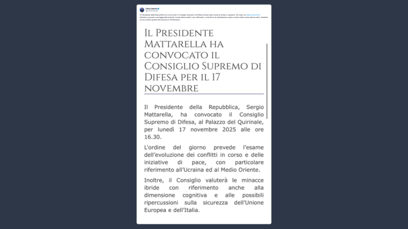 Il segretario di Azione, Carlo Calenda, ha scritto su X: «Il Presidente della Repubblica ha convocato il Consiglio Supremo di Difesa anche sulle minacce ibride e cognitive. Da mesi con Marco Lombardo abbiamo proposto una legge denominata “scudo democratico” per rafforzare i controlli su le interferenze russe e cinesi nella nostra democrazia. Sarebbe ora di portare questa discussione in Parlamento».