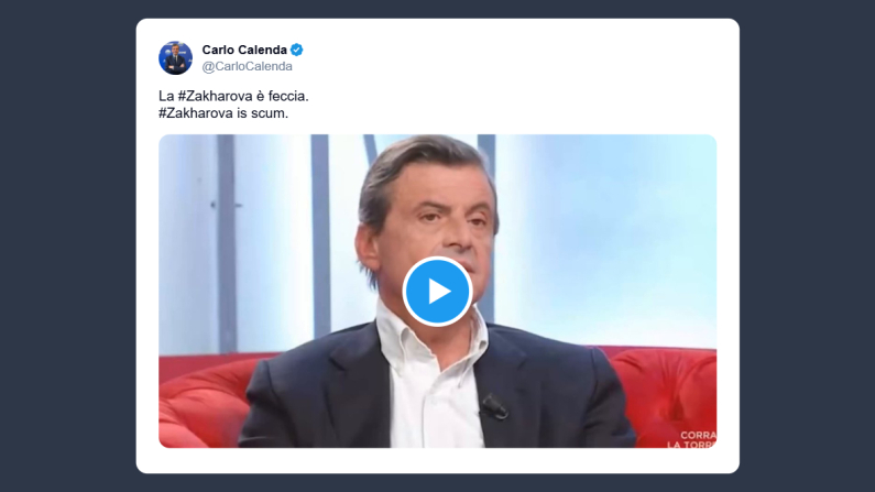 Il segretario di Azione, Carlo Calenda, ha scritto su X: «la Zakharova è feccia. Zacarova è feccia e forse bisognerebbe capire cosa sono i russi. Sono quelli che prendono e deportano i bambini ucraini in Russia, quelli che ammazzano i civili. Sa perché forse quelli che parlano in questo modo di una tragedia come questa? Sa perché forse dovremmo capirlo. Perché io vedo, ma proprio tanta gente in giro che parla, che ha voce pubblica, che in fondo continua a dire: “beh, però la Russia comunque c’ha le sue ragioni”. La Russia non ha nessuna ragione. È un posto guidato da spietati assassini che non danno valore alla vita, che non hanno moralità e a cui bisogna rispondere con una sola cosa, la fermezza e la forza di aiutare gli ucraini a sconfiggerli sul campo».