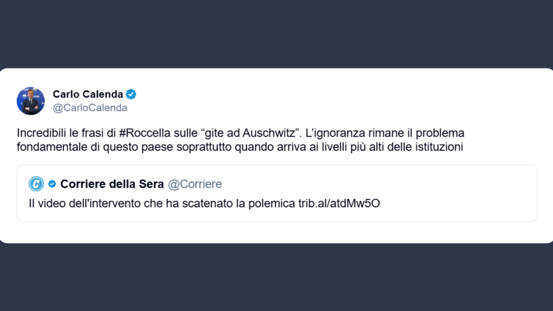 Il segretario di Azione, Carlo Calenda, ha definito ieri su X «incredibili» le frasi del ministro per la Famiglia, Eugenia Roccella, sulle «gite ad Auschwitz». L’ignoranza, dice Calenda, rimane il «problema fondamentale di questo Paese soprattutto quando arriva ai livelli più alti delle istituzioni». La Roccella ha dichiarato che l’Italia non avrebbe «fatto i conti fino in fondo» con l’antisemitismo: «tutte le gite scolastiche ad Auschwitz cosa sono state? Sono state gite? Sono state davvero gite? A che cosa sono servite? Secondo me, sono state incoraggiate e valorizzate perché servivano esattamente all’inverso: a dirci che l’antisemitismo […] era collocato ormai in un passato storico e in una precisa area: il fascismo. Le gite ad Auschwitz, secondo me, sono state un modo per ribadire che l’antisemitismo era una questione fascista e basta. E quindi che il problema era essere antifascisti, non essere antisemiti. Non controllare fino in fondo quello che è avvenuto nel nostro passato, non fare i conti fino in fondo con quello che è avvenuto».