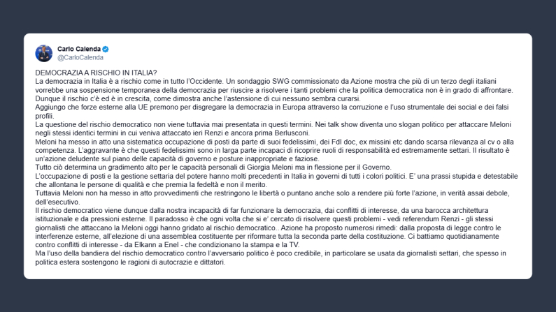 Calenda: la democrazia in Italia è a rischio come in tutto l’Occidente