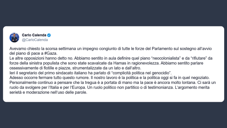 Il segretario di Azione, Carlo Calenda, ha scritto su X: «Avevamo chiesto la scorsa settimana un impegno congiunto di tutte le forze del Parlamento sul sostegno all’avvio del piano di pace a Gaza. Le altre opposizioni hanno detto no. Abbiamo sentito in aula definire quel piano “neocolonialista” e da “rifiutare” da forze della sinistra populista che sono state scavalcate da Hamas in ragionevolezza. Abbiamo sentito parlare ossessivamente di flotille e piazze, strumentalizzate da un lato e dall’altro. Ieri il segretario del primo sindacato italiano ha parlato di “complicità politica nel genocidio”». Ma per Calenda adesso bisogna «fermare tutto questo rumore. Il nostro lavoro è la politica, che oggi si fa in quel negoziato. Penso che la tregua è a portata di mano ma la pace è ancora lontana».