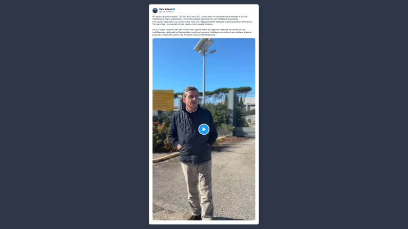 Il segretario di Azione, Carlo Calenda, ha scritto su X: «a Cassino si producevano 135 mila auto nel 2017. Quest’anno si chiuderà senza arrivare a 20 mila. Stabilimento dopo stabilimento, l’industria italiana sta morendo nell’indifferenza generale. Per questo oggi siamo qui, ancora una volta con i rappresentanti sindacali e gli imprenditori dell’indotto. Per ascoltare, ma soprattutto per capire come reagire insieme. Da qui voglio proporre agli altri leader delle opposizioni e ai segretari nazionali dei sindacati una mobilitazione nazionale sull’automotive, mentre al governo chiediamo un incontro per studiare insieme proposte e interventi, prima che Stellantis chiuda definitivamente».