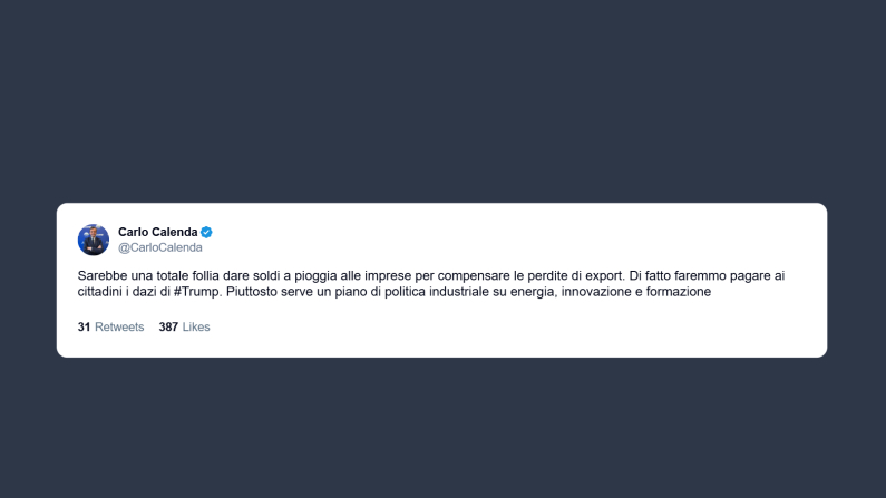 Carlo Calenda, leader di Azione, ha pubblicato un post su X, commentando il recente accordo tra Trump e la von der Leyen e il piano del Governo italiano in merito, affermando: «sarebbe una totale follia dare soldi a pioggia alle imprese. Di fatto faremmo pagare ai cittadini i dazi di Trump». Calenda ha proposto invece un «piano di politica industriale su energia, innovazione e formazione».