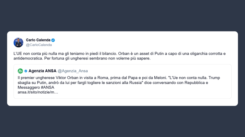 Il segretario di Azione, Carlo Calenda, ha commentato un post su X dell’agenzia Ansa che riporta le dichiarazioni di Orban in visita a Roma: «l’Ue non conta più nulla. Trump sbaglia su Putin andrò da lui per fargli togliere le sanzioni alla Russia». Nel suo commento Calenda ha dichiarato che «l’Ue non conta più nulla, ma gli teniamo in piedi il bilancio. Orban è un asset di Putin a capo di una oligarchia corrotta e antidemocratica. Per fortuna gli ungheresi sembrano non volerne più sapere».