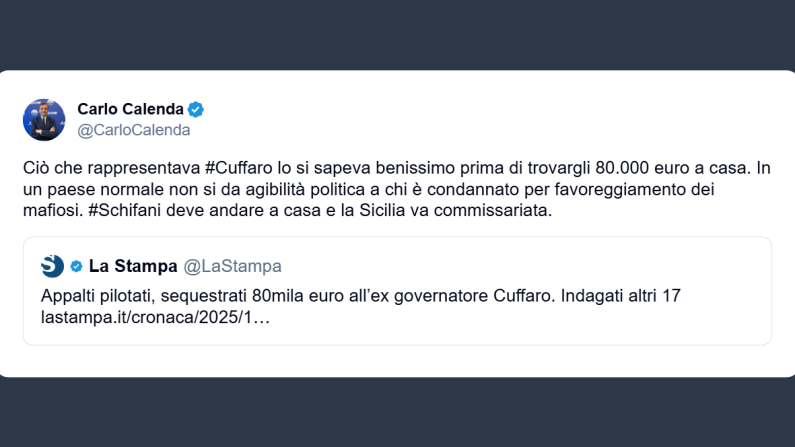 Il segretario di Azione, Carlo Calenda, ha scritto ieri su X: «Ciò che rappresentava Cuffaro lo si sapeva benissimo prima di trovargli 80 mila euro a casa. In un Paese normale non si dà agibilità politica a chi è condannato per favoreggiamento dei mafiosi. Schifani deve andare a casa e la Sicilia va commissariata».