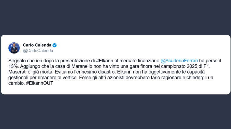 «Segnalo che ieri dopo la presentazione di Elkann al mercato finanziario, la Scuderia Ferrari ha perso il 13%. Aggiungo che la casa di Maranello finora non ha vinto una gara nel campionato 2025 di F1». Lo ha dichiarato su X il segretario di Azione, Carlo Calenda. Maserati – spiega il segretario – è già morta: «Evitiamo l’ennesimo disastro. Elkann non ha oggettivamente le capacità gestionali per rimanere al vertice. Forse gli altri azionisti dovrebbero farlo ragionare e chiedergli un cambio».