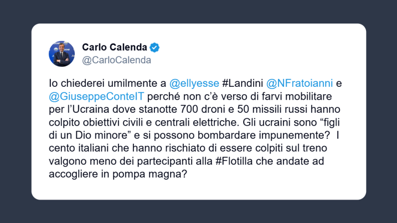 «Io chiederei umilmente a Schlein, Landini, Fratoianni e Conte perché non c’è verso di farvi mobilitare per l’Ucraina dove stanotte 700 droni e 50 missili russi hanno colpito obiettivi civili e centrali elettriche». Lo ha dichiarato il segretario di Azione, Carlo Calenda, su X. Calenda ha poi concluso chiedendo: «Gli ucraini sono figli di un Dio minore e si possono bombardare impunemente? E i cento italiani che hanno rischiato di essere colpiti sul treno valgono meno dei partecipanti alla Flotilla che andate ad accogliere in pompa magna?».