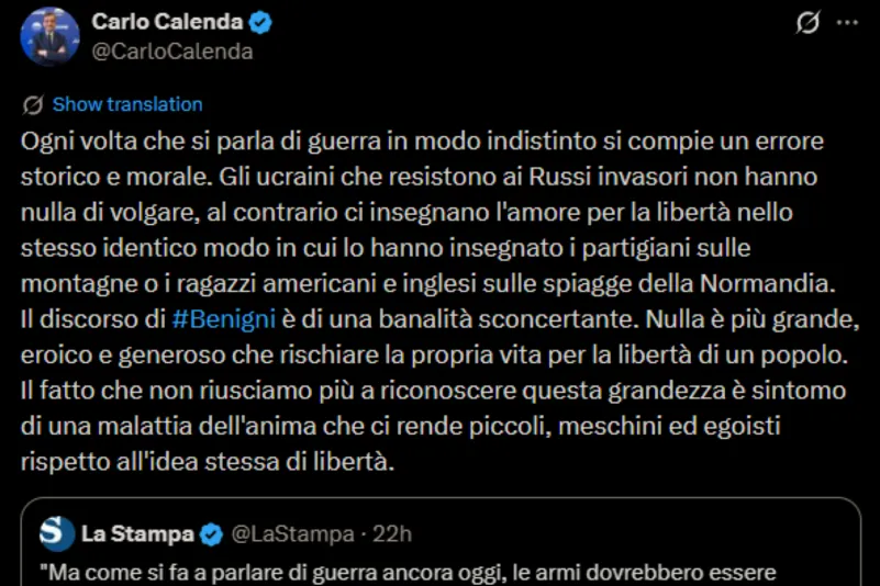 Calenda nel suo commento ha dichiarato: «ogni volta che si parla di guerra in modo indistinto si compie un errore storico e morale. Gli ucraini che resistono ai russi invasori non hanno nulla di volgare, al contrario ci insegnano l’amore per la libertà nello stesso identico modo in cui lo hanno insegnato i partigiani sulle montagne o i ragazzi americani e inglesi sulle spiagge della Normandia. Il discorso di Benigni è di una banalità sconcertante. Nulla è più grande, eroico e generoso che rischiare la propria vita per la libertà di un popolo. Il fatto che non riusciamo più a riconoscere questa grandezza è sintomo di una malattia dell’anima che ci rende piccoli, meschini ed egoisti rispetto all’idea stessa di libertà».