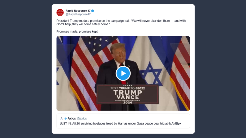 La Casa Bianca ha ricordato su X la promessa del presidente Trump fatta in campagna elettorale sul rilascio degli ostaggi a Gaza: «Non li abbandoneremo mai e, con l’aiuto di Dio, torneranno a casa sani e salvi. «Promessa fatta, promessa mantenuta».