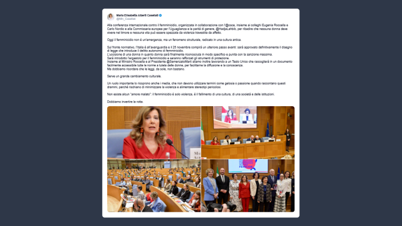 Il ministro per le Riforme istituzionali e la semplificazione normativa, Maria Elisabetta Alberti Casellati, ha scritto su X: «alla conferenza internazionale contro il femminicidio, organizzata in collaborazione con l’Osce, insieme ai colleghi Eugenia Roccella e Carlo Nordio e alla Commissaria europea per l’Uguaglianza e la parità di genere, Hadja Lahbib, per ribadire che nessuna donna deve vivere nel timore e nessuna vita può essere spezzata da violenza travestita da affetto. Oggi il femminicidio non è un’emergenza, ma un fenomeno strutturale, radicato in una cultura antica. Sul fronte normativo, l’Italia è all’avanguardia e il 25 novembre compirà un ulteriore passo avanti, sarà approvato definitivamente il disegno di legge che introduce il delitto autonomo di femminicidio. L’uccisione di una donna in quanto donna sarà finalmente riconosciuta in modo specifico e punita con la sanzione massima. Sarà introdotto l’ergastolo per il femminicidio e saranno rafforzati gli strumenti di protezione. Insieme al ministro Roccella e al presidente Martina Semenzato stiamo inoltre lavorando a un testo unico che raccoglierà in un documento facilmente accessibile tutte le norme a tutela delle donne, per facilitarne la diffusione e la conoscenza. Ma dobbiamo ricordare che le leggi, da sole, non bastano. Serve un grande cambiamento culturale. Un ruolo importante lo ricoprono anche i media, che non devono utilizzare termini come gelosia o passione quando raccontano questi drammi, perché rischiano di minimizzare la violenza e alimentare stereotipi pericolosi. Non esiste alcun “amore malato”, il femminicidio è solo violenza, è il fallimento di una cultura, di una società e delle istituzioni. Dobbiamo invertire la rotta».