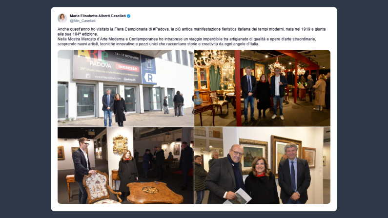Il ministro per le Riforme istituzionali e la semplificazione normativa, Maria Elisabetta Alberti Casellati, ha scritto su X: «anche quest’anno ho visitato la Fiera Campionaria di Padova, la più antica manifestazione fieristica italiana dei tempi moderni, nata nel 1919 è giunta alla sua 104ª edizione. Nella mostra mercato d’arte moderna e contemporanea ho intrapreso un viaggio imperdibile tra artigianato di qualità e opere d’arte straordinarie, scoprendo nuovi artisti, tecniche innovative e pezzi unici che raccontano storie e creatività da ogni angolo d’Italia».