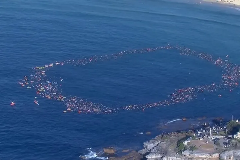 Centinaia di nuotatori e surfisti sono entrati in acqua venerdì 19 dicembre sulla spiaggia di Bondi, a Sydney, per rendere omaggio alle 15 vittime uccise dagli attentatori armati, padre e figlio, che hanno aperto il fuoco contro persone che celebravano Hanukkah.
