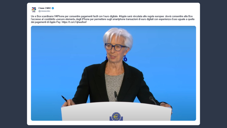 La testata giornalistica economico finanziaria italiana Class Cnbc, ha scritto su X: «Ue e Bce scardinano l’iPhone per consentire pagamenti facili con l’euro digitale. Apple sarà vincolata alle regole europee: dovrà consentire alla Bce l’accesso al cosiddetto secure element degli iPhone per permettere sugli smartphone transazioni di euro digitali con esperienza d’uso uguale a quella dei pagamenti di Apple Pay».