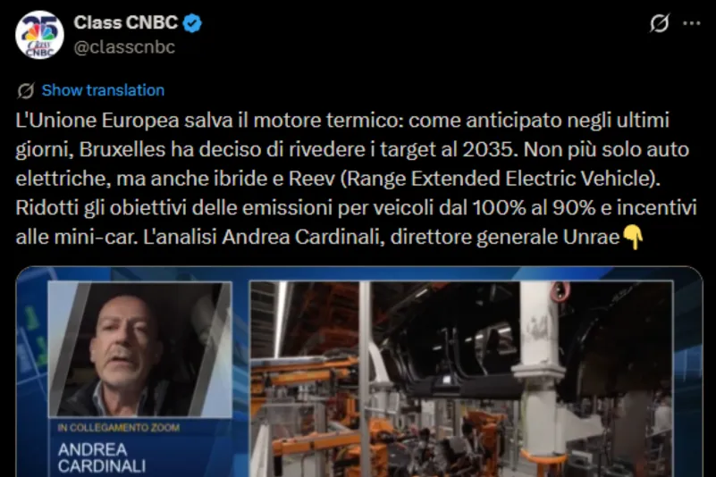 Class CNBC ha scritto su X: «l’Unione Europea salva il motore termico: come anticipato negli ultimi giorni, Bruxelles ha deciso di rivedere i target al 2035. Non più solo auto elettriche, ma anche ibride e Reev (Range Extended Electric Vehicle). Ridotti gli obiettivi delle emissioni per veicoli dal 100% al 90% e incentivi alle mini-car. L’analisi Andrea Cardinali, direttore generale Unrae».