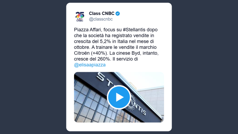 La testata giornalistica economico-finanziaria italiana Class Cnbc, ha scritto su X: «Piazza Affari, focus su Stellantis dopo che la società ha registrato vendite in crescita del 5,2% in Italia nel mese di ottobre. A trainare le vendite il marchio Citroën (+40%). La cinese Byd, intanto, cresce del 260%».