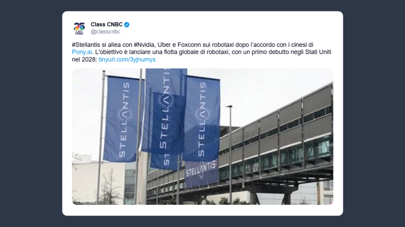 «Stellantis si allea con Nvidia, Uber e Foxconn sui robotaxi dopo l’accordo con i cinesi di Pony.ai. L’obiettivo è lanciare una flotta mondiale di robotaxi, con un primo debutto negli Stati Uniti nel 2028».