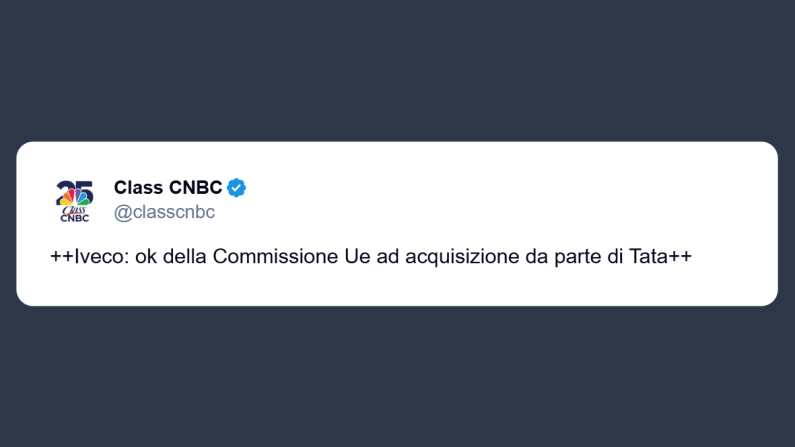 La testata giornalistica economico finanziaria italiana Class Cnbc, ha scritto su X sull’acquisizione del controllo esclusivo di Iveco Group: «ok della Commissione Ue ad acquisizione da parte di Tata Motors».