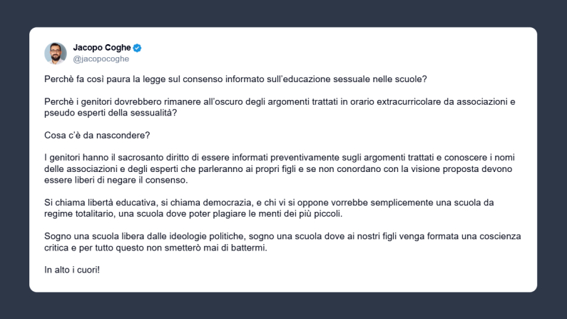 Il portavoce di Pro Vita & Famiglia, Jacopo Coghe, ha scritto ieri su X: «perché fa così paura la legge sul consenso informato sull’educazione sessuale nelle scuole?Perché i genitori dovrebbero rimanere all’oscuro degli argomenti trattati in orario extracurricolare da associazioni e pseudo esperti della sessualità? Cosa c’è da nascondere?»