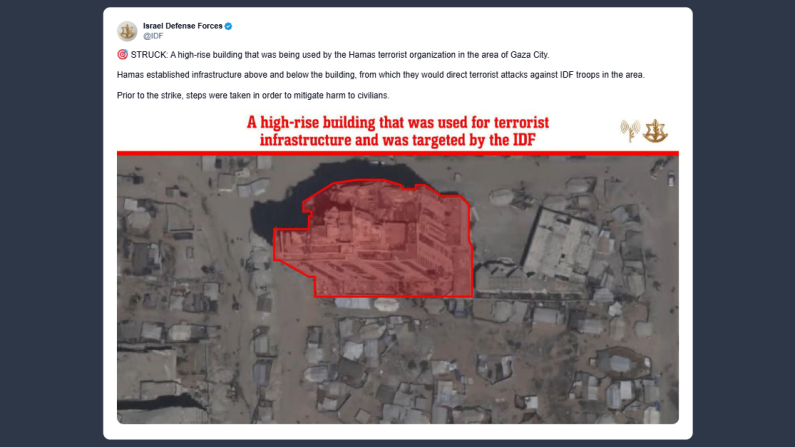 Le Forze di Difesa Israeliane hanno colpito un edificio a più piani utilizzato dall’organizzazione terroristica Hamas, a Gaza City. «Hamas aveva creato infrastrutture sopra e sotto l’edificio, da cui dirigeva attacchi terroristici contro le truppe delle Idf nella zona. Prima dell’attacco, sono state adottate misure per ridurre al minimo i danni ai civili».