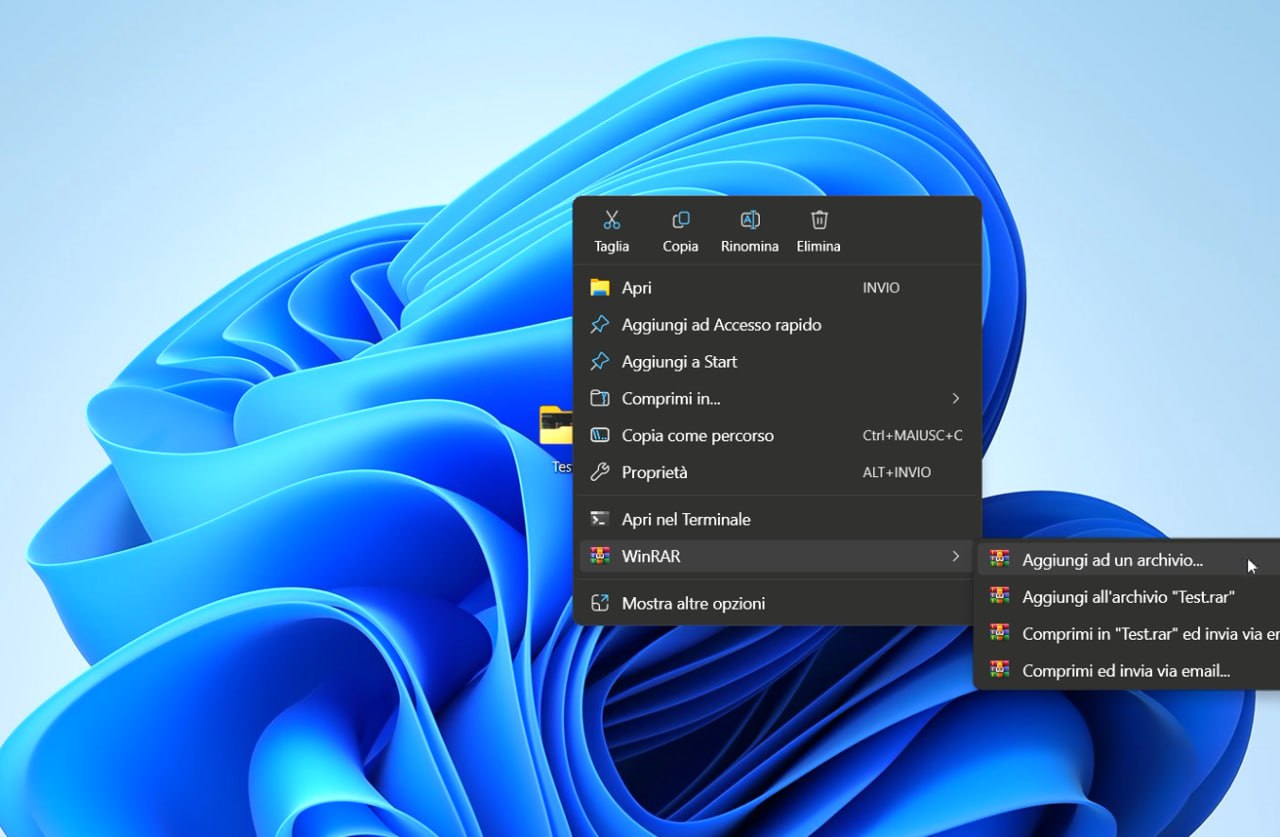 Una volta installato, basta cliccare col tasto destro del mouse sulla cartella/file desiderato. Sulla voce WinRar bisogna selezionare l’opzione Aggiungi ad un archivio…