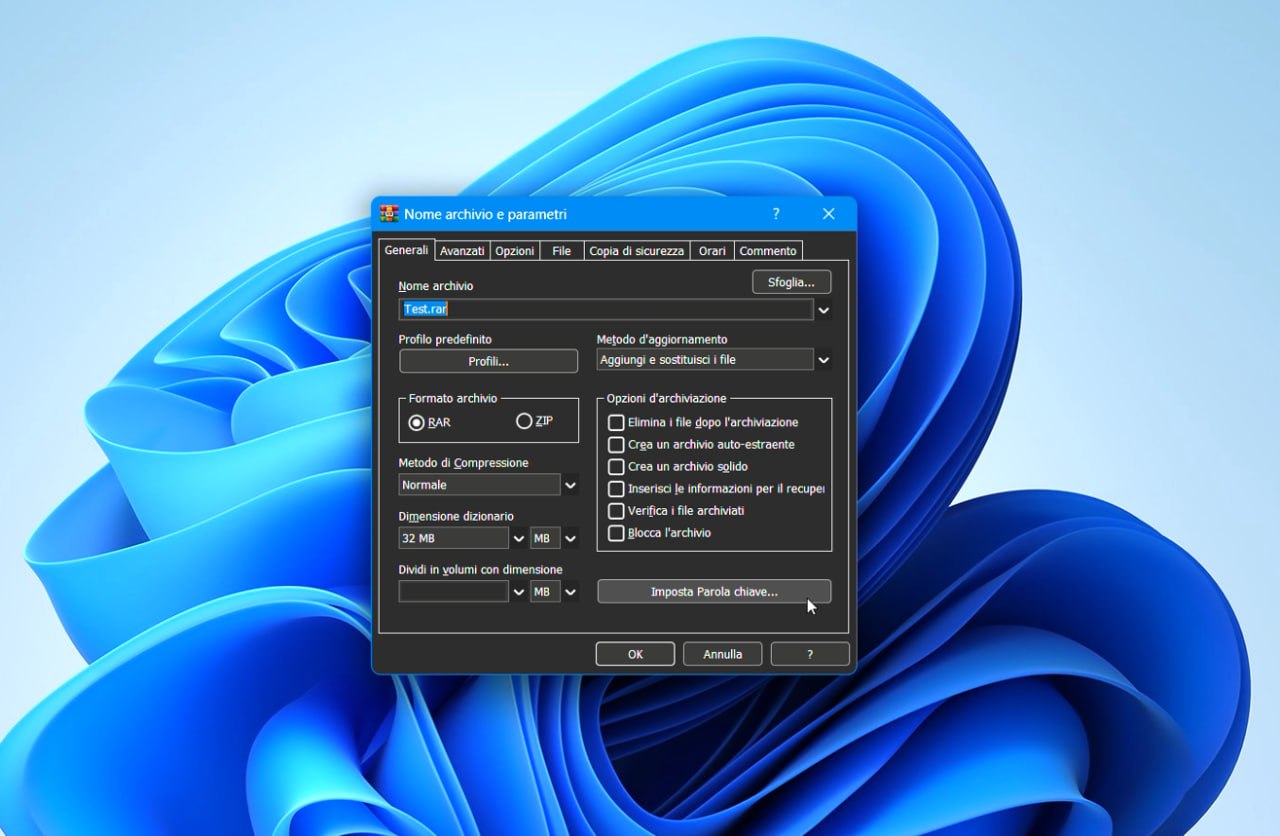 L’opzione più interessante è sicuramente quella di impostare una password per l’archivio. Per farlo basta cliccare sul pulsante Imposta Parola Chiave… in basso.