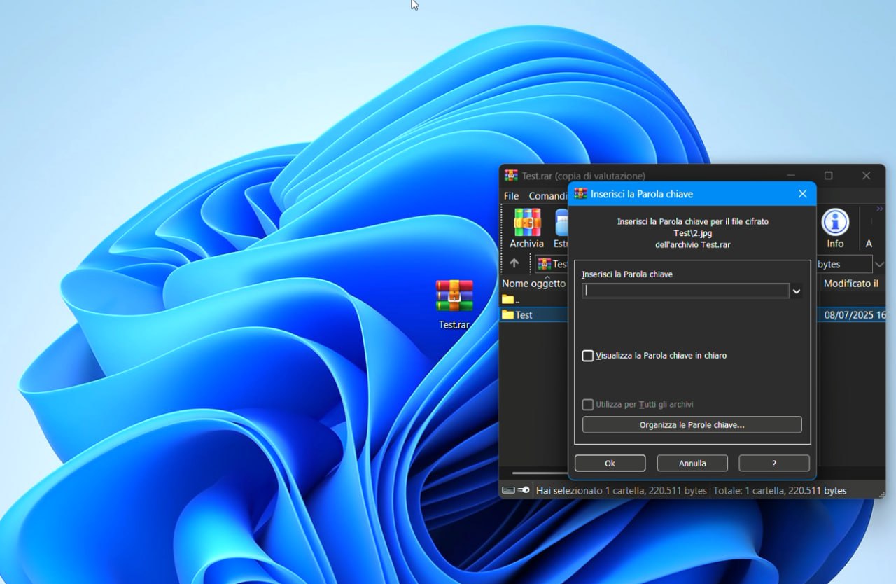 Una volta premuto su Ok il gioco è fatto. Da questo momento in poi sarà possibile accedere al file compresso solamente inserendo la parola chiave scelta.