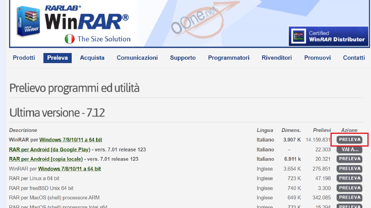 É qui che entra in gioco WinRar. Questa applicazione permette appunto di archiviare i file per risparmiare spazio, ed è possibile scaricarla dal sito ufficiale. Per scaricarlo, basta cliccare sul pulsante Preleva accanto alla voce “WinRAR per Windows 7/8/10/11 a 64 bit”.