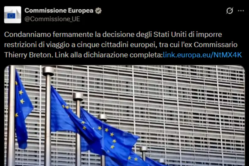 La Commissione europea ha scritto su X: «condanniamo fermamente la decisione degli Stati Uniti di imporre restrizioni di viaggio a cinque cittadini europei, tra cui l’ex Commissario Thierry Breton».