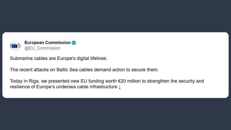 La Commissione europea ha scritto su X: «I cavi sottomarini rappresentano le arterie digitali dell’Europa. I recenti attacchi ai cavi del Mar Baltico richiedono interventi urgenti per garantirne la sicurezza. Oggi a Riga abbiamo annunciato un nuovo finanziamento dell’Unione Europea da 20 milioni di euro per rafforzare la protezione e la resilienza delle infrastrutture di cavi sottomarini in Europa».