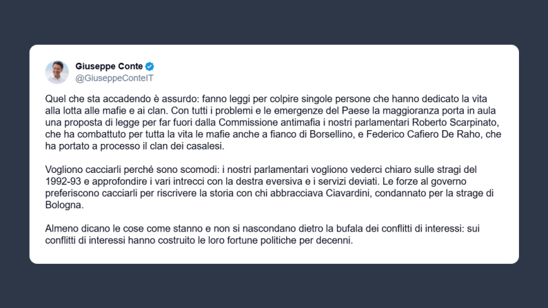 Il capo del Movimento 5 Stelle, Giuseppe Conte, ha scritto ieri su X: «Quel che sta accadendo è assurdo: fanno leggi per colpire singole persone che hanno dedicato la vita alla lotta alle mafie e ai clan. Con tutti i problemi e le emergenze del Paese la maggioranza porta in aula una proposta di legge per far fuori dalla Commissione antimafia i nostri parlamentari Roberto Scarpinato, che ha combattuto per tutta la vita le mafie anche a fianco di Borsellino, e Federico Cafiero De Raho, che ha portato a processo il clan dei casalesi». Vogliono cacciarli – spiega Conte – perché «sono scomodi: i nostri parlamentari vogliono vederci chiaro sulle stragi del 1992-93 e approfondire i vari intrecci con la destra eversiva e i servizi deviati. Le forze al governo preferiscono cacciarli per riscrivere la storia con chi abbracciava Ciavardini, condannato per la strage di Bologna».