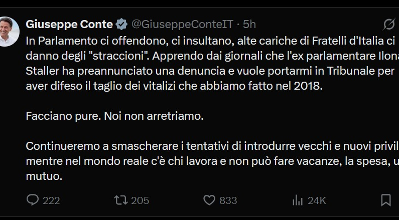Giuseppe Conte, presidente del Movimento 5 Stelle, ha scritto su X: «in Parlamento le alte cariche di Fratelli d’Italia ci danno degli “straccioni”. Apprendo dai giornali che l’ex parlamentare Ilona Staller ha preannunciato una denuncia e vuole portarmi in Tribunale per aver difeso il taglio dei vitalizi che abbiamo fatto nel 2018».